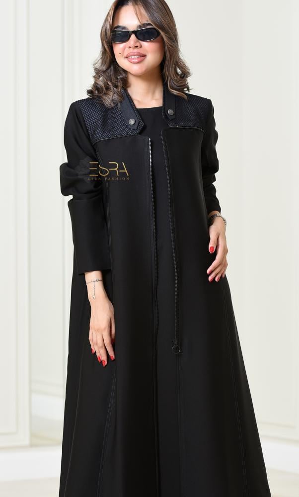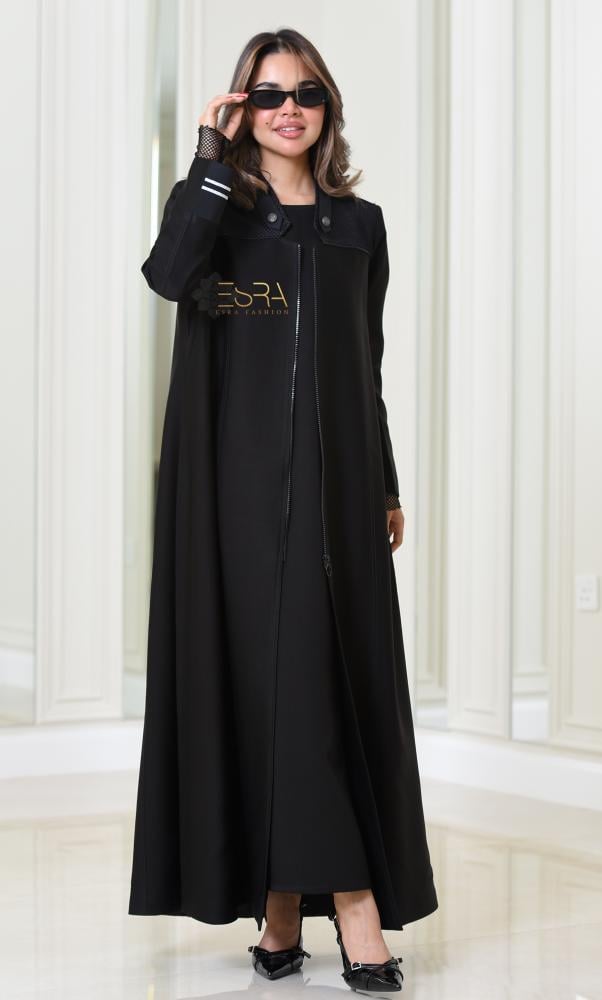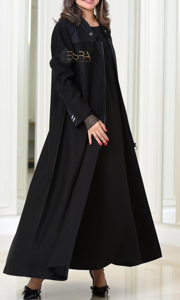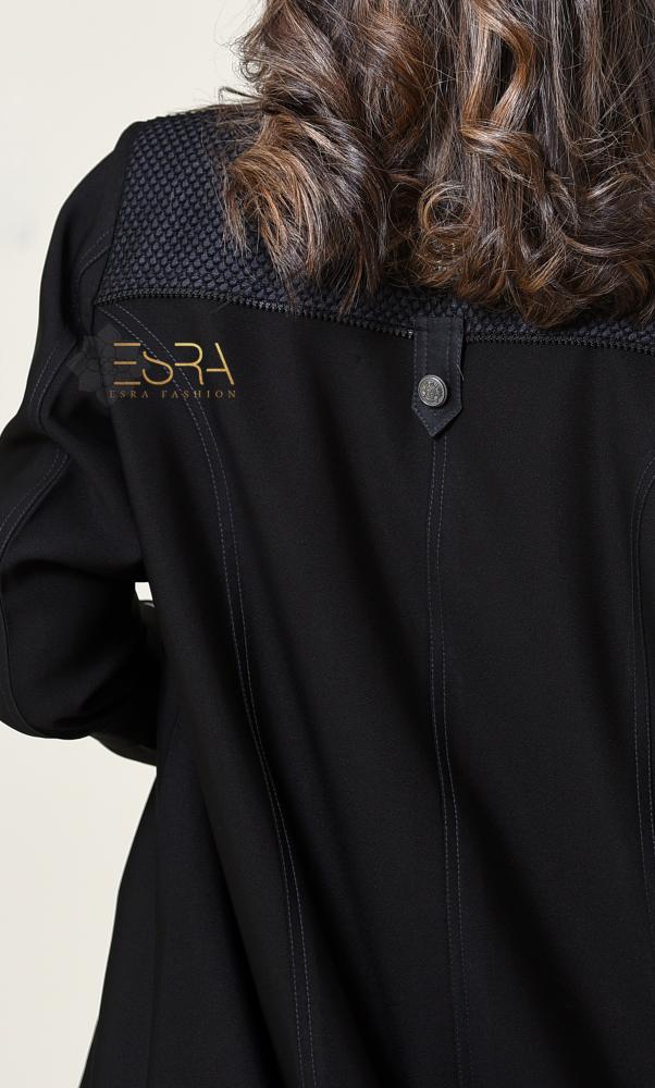• وصف المنتج :عباية بقصة البليزر بأسلوب سبورت عصري وعملي من قماش الكريب، يزينها قماش الشبك المبطن من الداخل باللون الكحلي، مع خطوط تطريز باللون الكحلي من الأمام والخلف تضيف لمسة فخامة. مزودة بسحاب في المنتصف يمكن التحكم به، ومزيّنة بأزرار فضية من معدن الزنك. الأكمام بتصميم مبتكر يمكن ارتداؤها بطريقتين، مع فتحة من الخلف قطعة عملية وفخمة تجمع بين التميز والأناقة.
