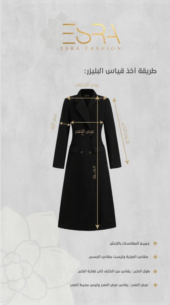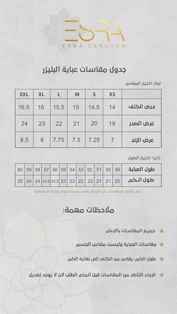 -قبل الطلب أرجاء الاطلاع على جدول المقاسات الخاصة بـ ((عباية البليزر ))